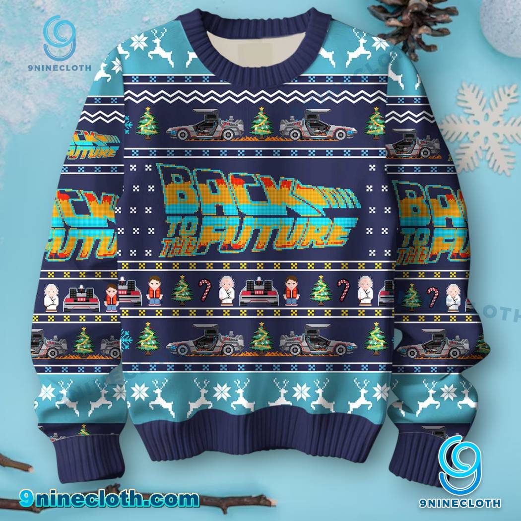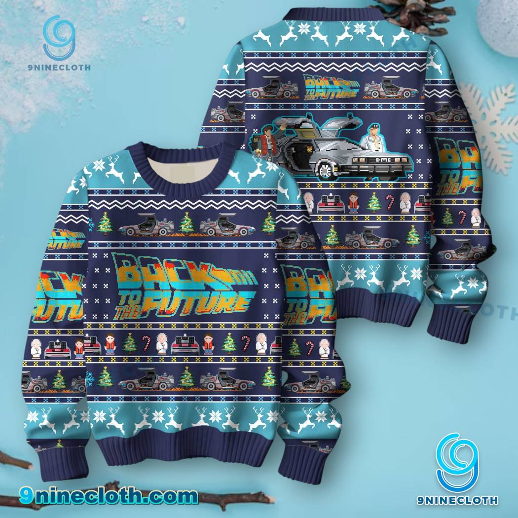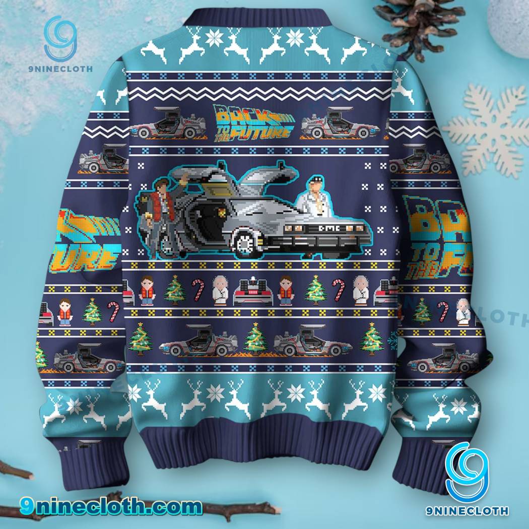 Keywords: Back To The Future, Ugly Christmas Sweater, Christmas Sweater, Pixel Art, Holiday Sweater, 80s Movies, Marty McFly, Doc Brown, Xmas Sweater, 9ninecloth, Time Travel, Geeky Christmas, Pop Culture Sweater