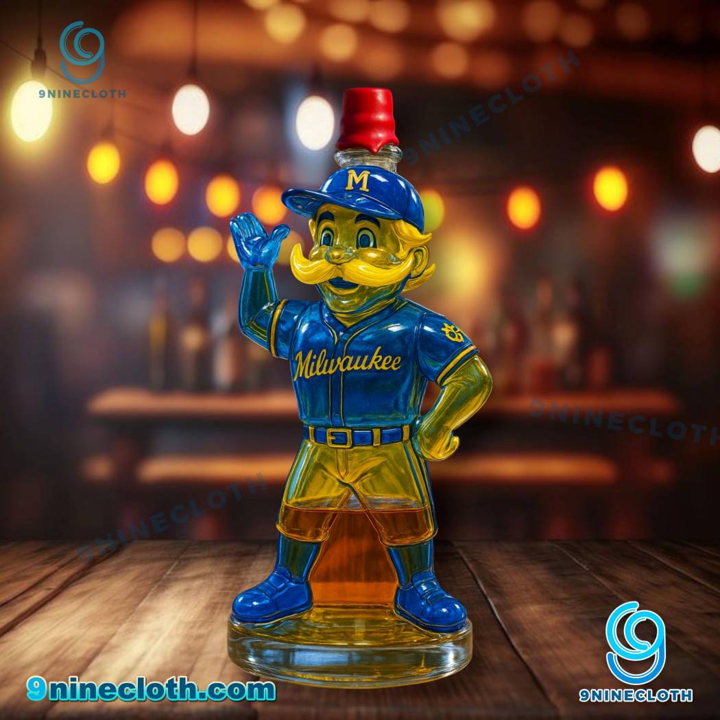 Keywords: Bernie Brewer, Milwaukee Brewers, mascot, whiskey bottle, baseball, MLB, Brewers fan, sports collectible, home bar, unique gift, 9ninecloth, Brewers merchandise.