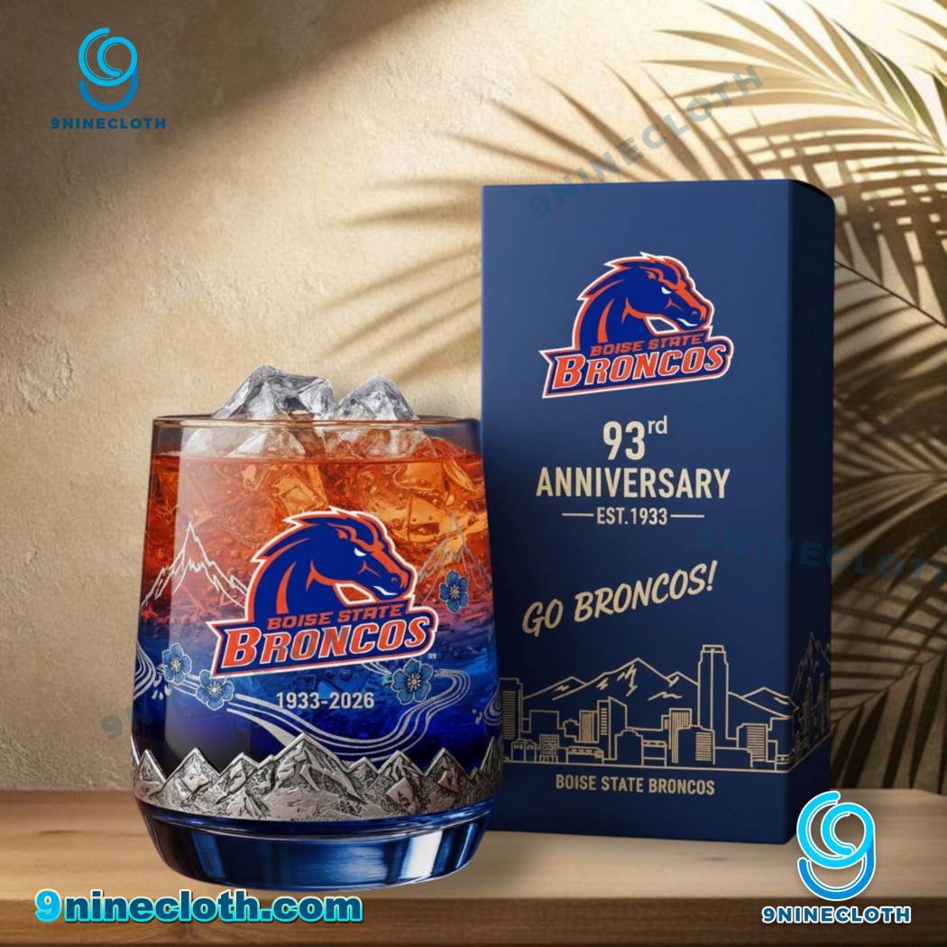 Keywords: Boise State Broncos, Anniversary, Whiskey Glass, Broncos, 1933-2026, College, Football, University, Drinkware, Barware, Gift, Fan Gear, 9ninecloth, Alumni, Celebration