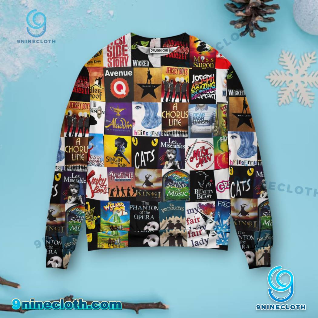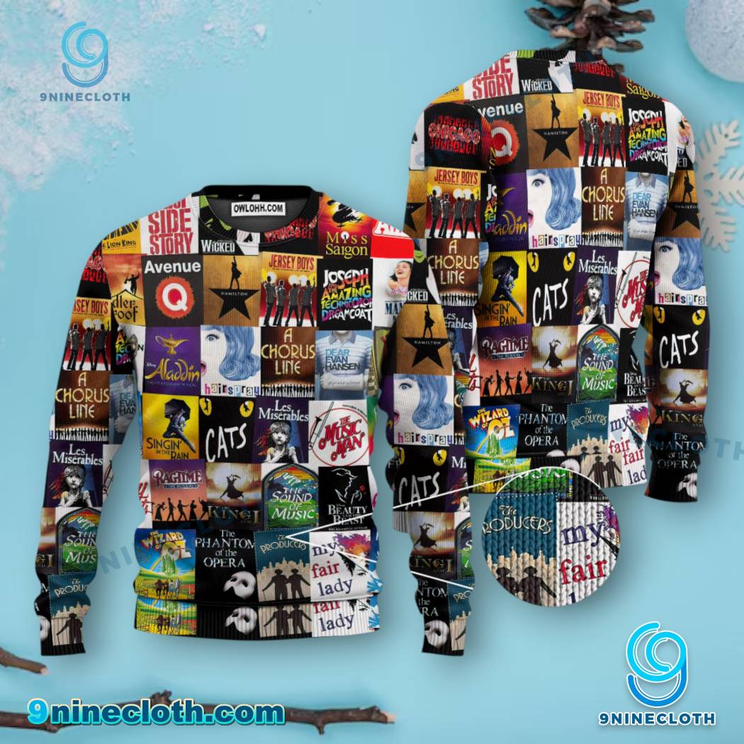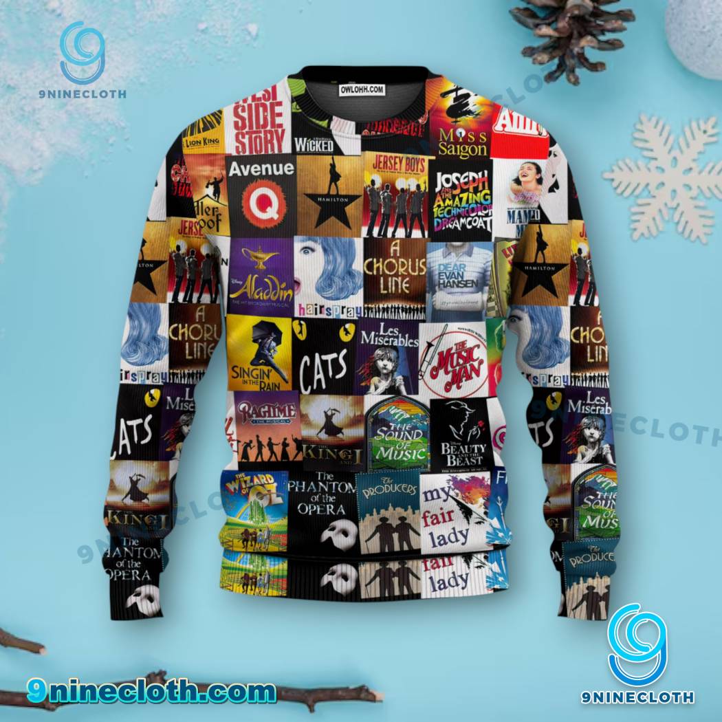 Keywords: Broadway, Musical Theater, Christmas Sweater, Holiday Sweater, Xmas Sweater, Theater Lover, Festive Apparel, Holiday Fashion, 9ninecloth, Winter Clothing, Polyester, Spandex, Gift for Theater Fan