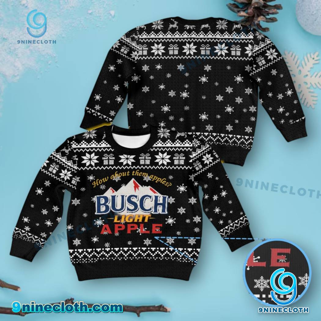 Keywords: Busch Light Apple, Christmas Sweater, Holiday Sweater, “How About Them Apples”, Ugly Christmas Sweater, Beer Sweater, Funny Sweater, Holiday Party, Winter Fashion, 9ninecloth, Alcohol, Festive, Xmas