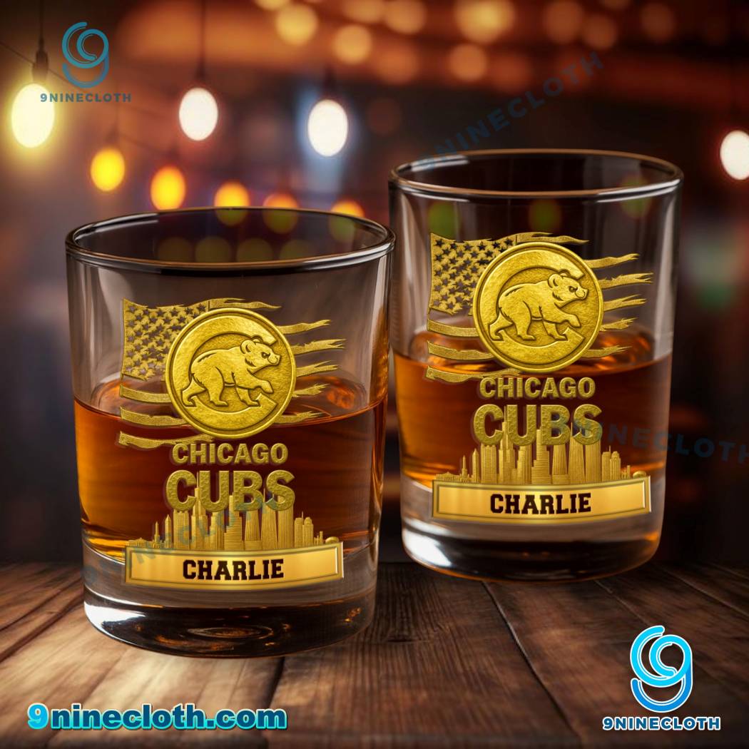 Keywords: Chicago Cubs, American Flag, City Skyline, Whiskey Glass, Personalized Gift, Baseball Fan, Chicago, Sports Memorabilia, Home Bar, Drinkware, 9ninecloth, Cubs, Patriotic, Souvenir