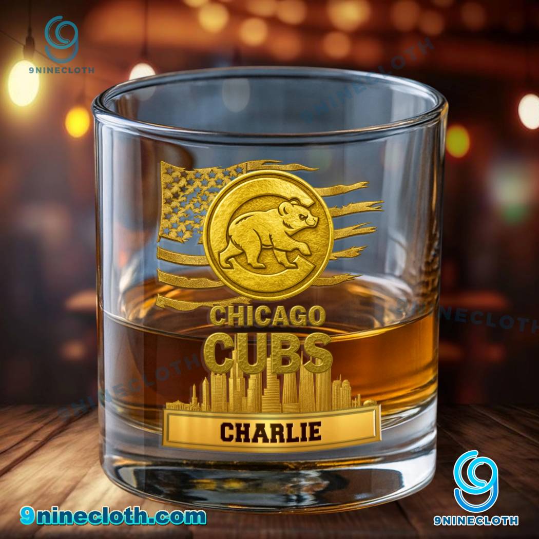 Elevate Your Spirits with the Chicago Cubs American Flag City Skyline Personalized Whiskey Glass