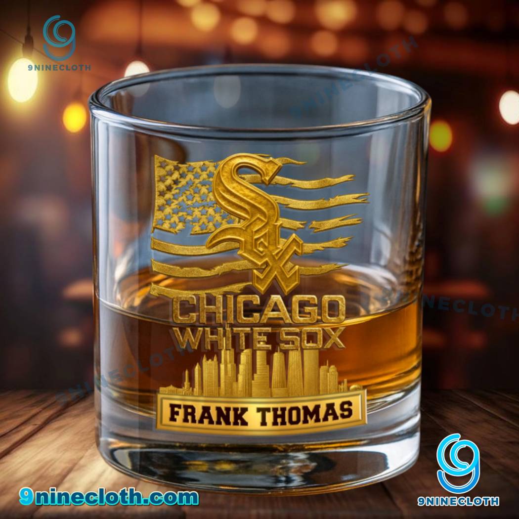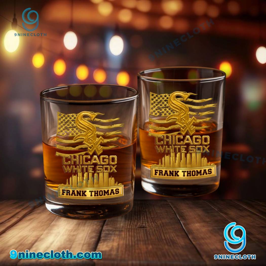 Keywords: Chicago White Sox, Whiskey Glass, American Flag, City Skyline, Personalized Gift, Baseball, Bourbon Glass, Chicago, Sports Fan, Souvenir, Drinkware, 9ninecloth, Gift for Him, Gift for Her, Patriotic, Team Spirit