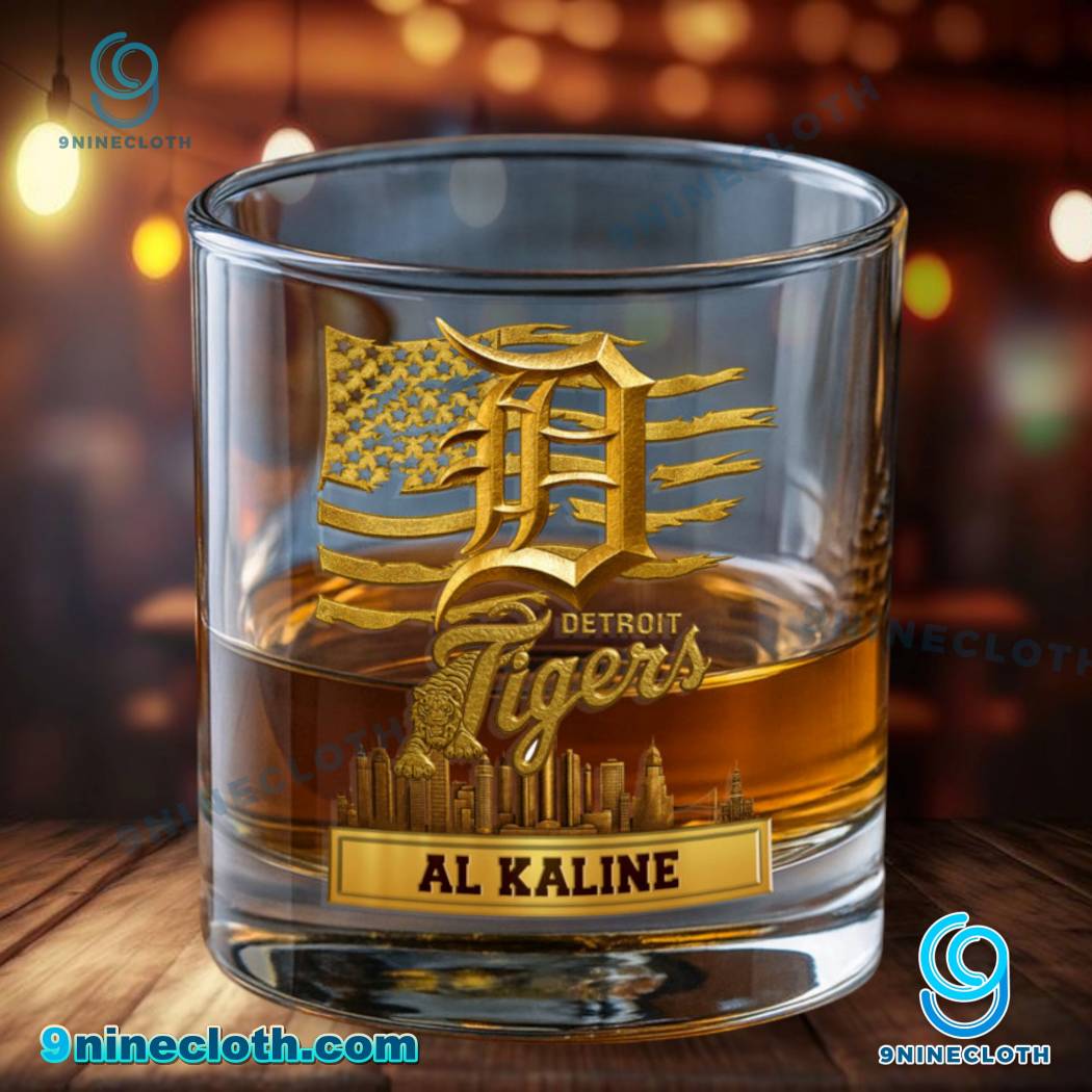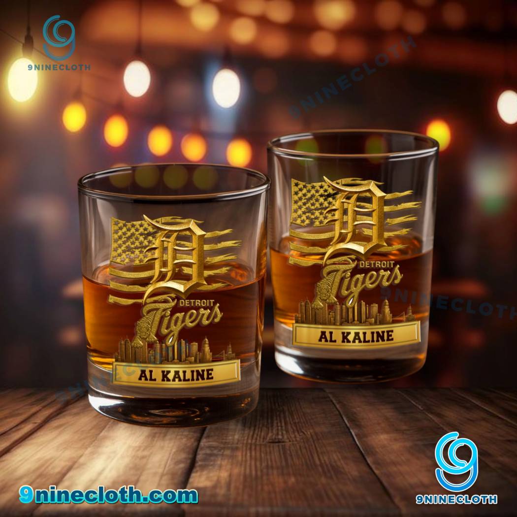 Keywords: Detroit Tigers, Whiskey Glass, American Flag, City Skyline, Detroit, Personalized Gift, Baseball, MLB, Sports Fan, Home Bar, Drinkware, 9ninecloth, Gift for Him, Gift for Her.