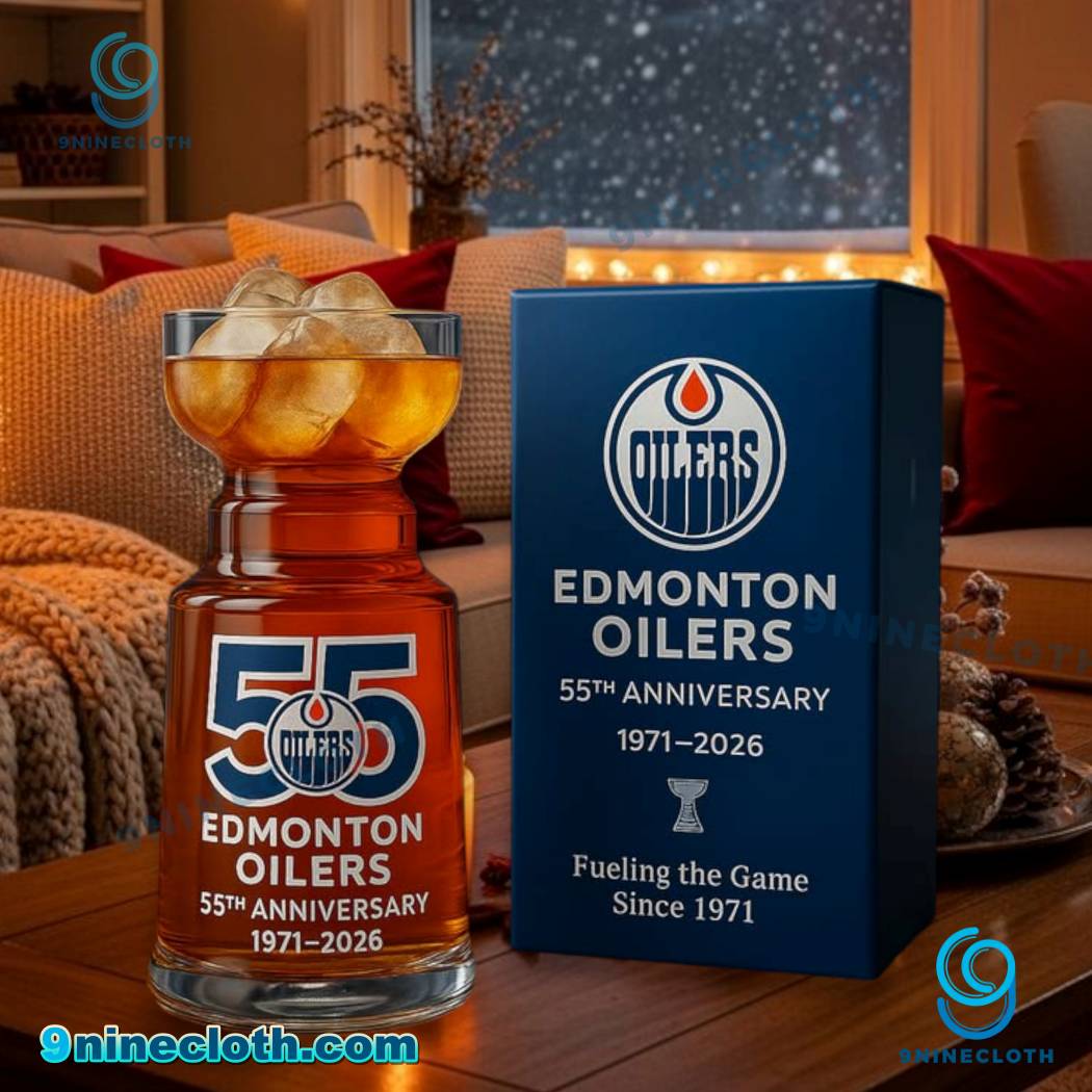 Keywords: Edmonton Oilers, Stanley Cup Champions, 55th Anniversary, Whiskey Glass, Hockey, NHL, Gift, Souvenir, Collectible, Barware, Drinkware, 9ninecloth, Oilers Fan, Premium Glass