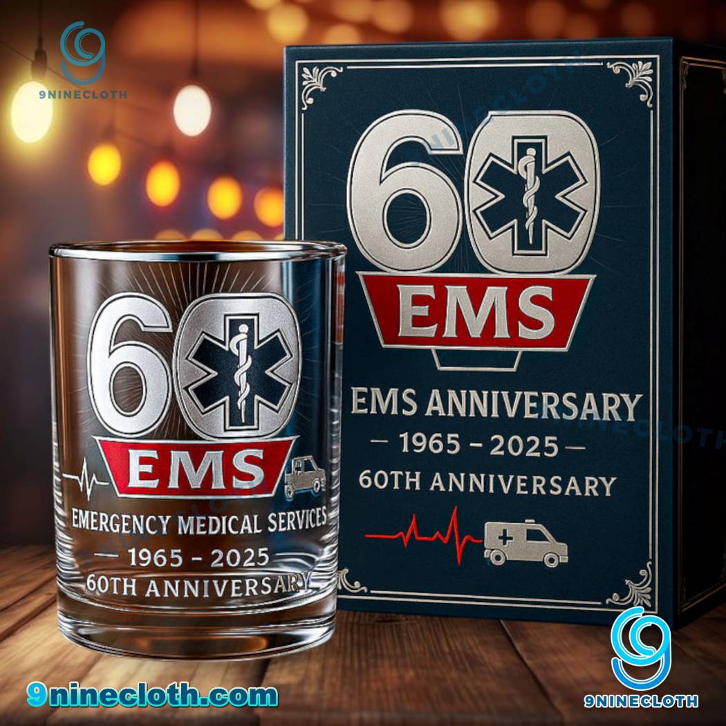 Keywords: EMS Anniversary, 60th Anniversary, Whiskey Glass, Bourbon Glass, EMS 1965-2025, Emergency Medical Services, First Responders, Gift for EMS, Commemorative Glass, Collectible Glassware, 9ninecloth, High-Quality Glass, Drinking Glass, Barware, EMS Appreciation