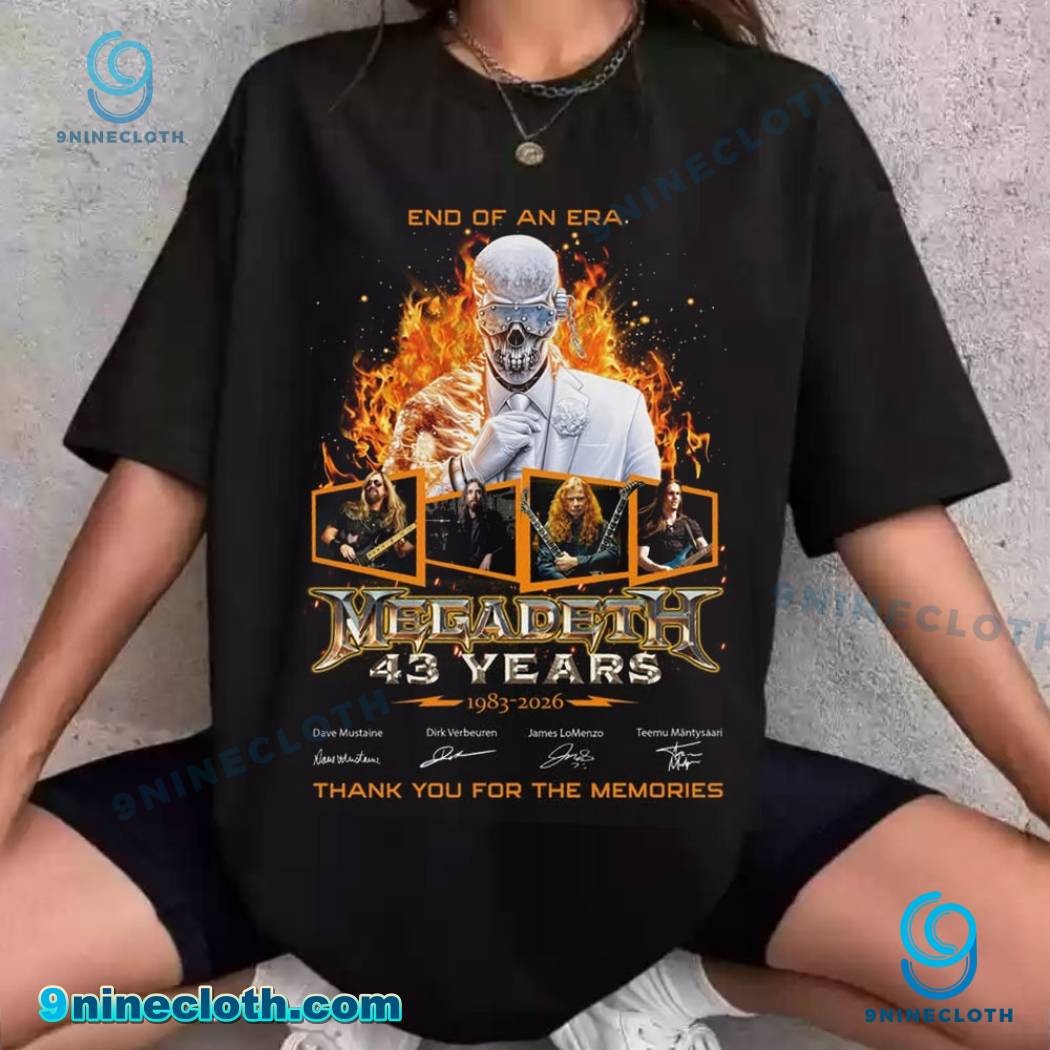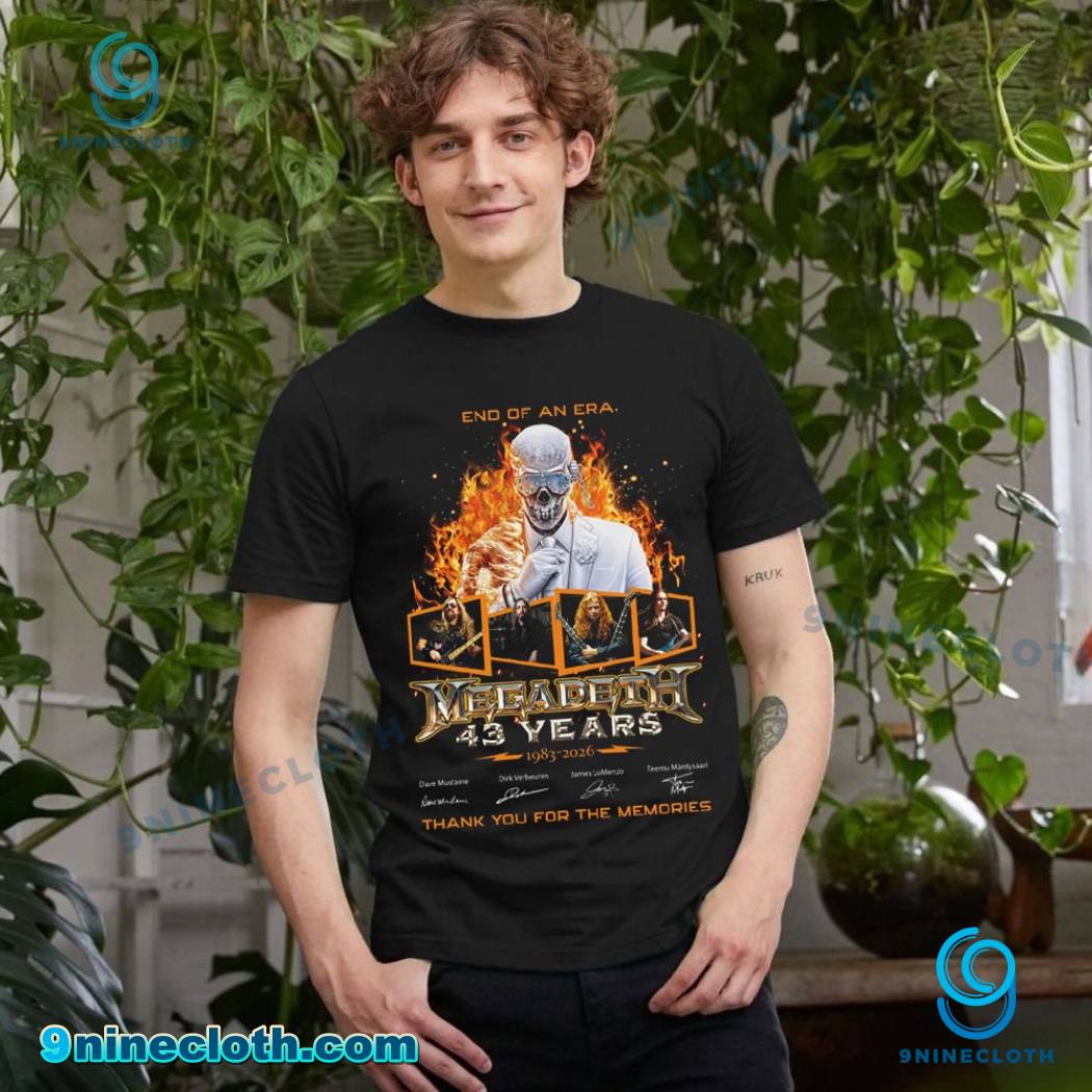 Keywords: Megadeth, End Of An Era, 43 Years, 1983-2026, Signatures, T-shirt, Thrash Metal, Music, Band Merch, Concert, Heavy Metal, 9ninecloth, Fan Apparel, Limited Edition