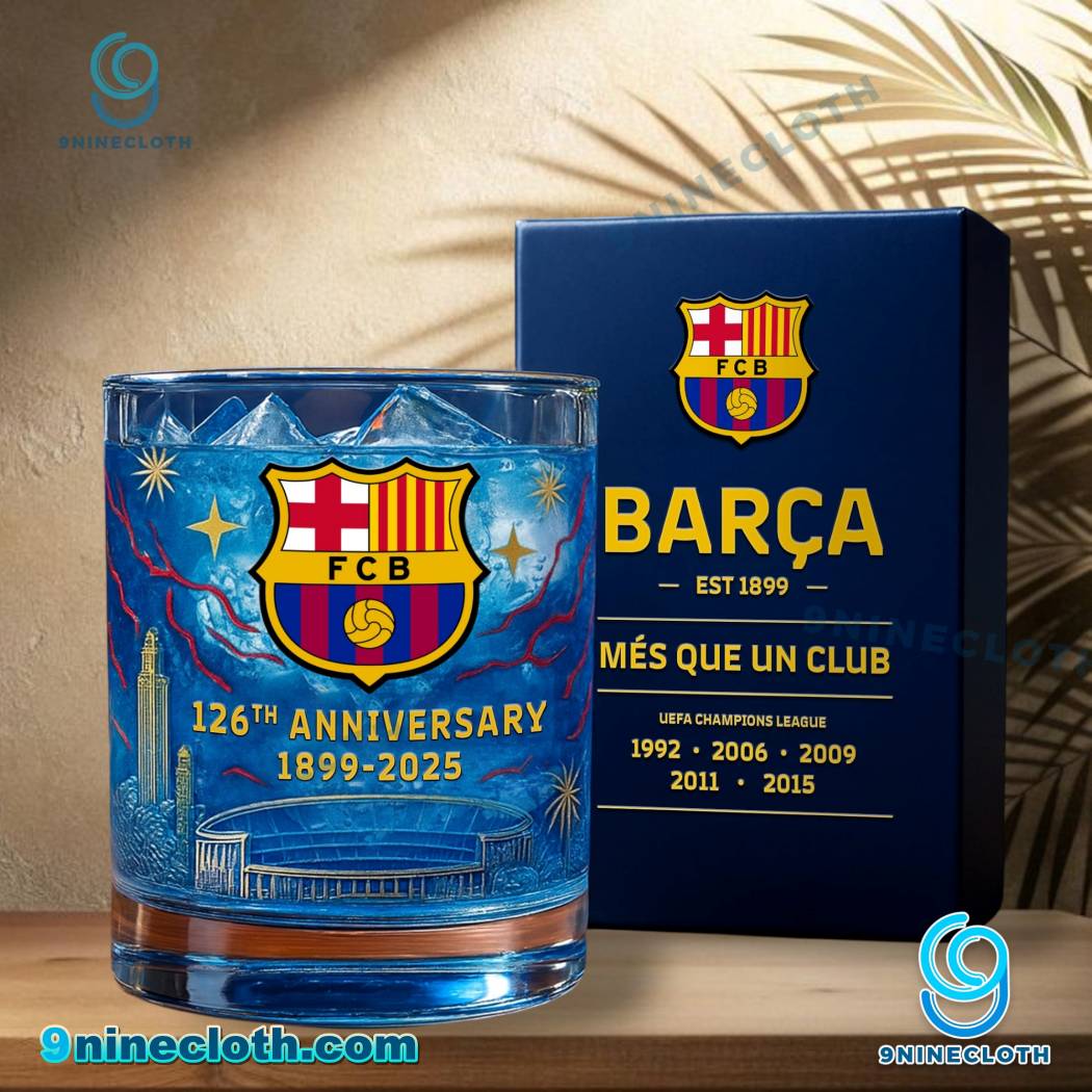 Keywords: FC Barcelona, Barcelona, Barça, Whiskey Glass, Anniversary, 126th Anniversary, Football Club, Soccer, Limited Edition, Collectible, Gift, Fan Merchandise, 1899, 2025, 9ninecloth, Drinkware, Barware