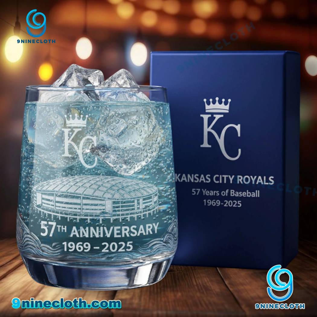 Keywords: Kansas City Royals, Royals, Baseball, MLB, 57th Anniversary, Whiskey Glass, Glassware, Barware, Sports Memorabilia, Fan Gear, Gifts for Royals Fans, 9ninecloth