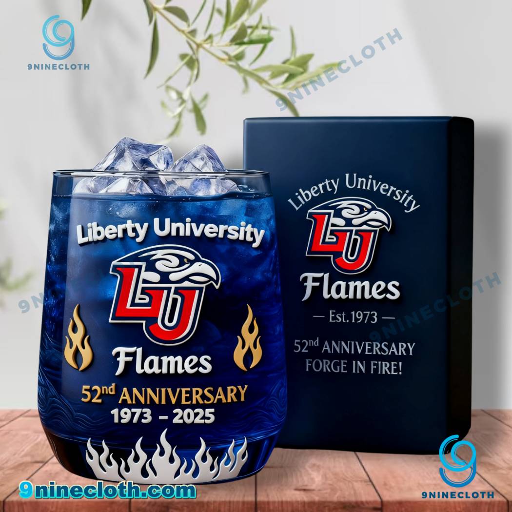 Keywords: Liberty Flames, 52nd Anniversary, Whiskey Glass, Flames, Liberty University, College Sports, Fan Gear, Drinkware, Bourbon Glass, Scotch Glass, 1973-2025, Gift for Flames Fan, 9ninecloth, High-Quality Glass, Sports Memorabilia