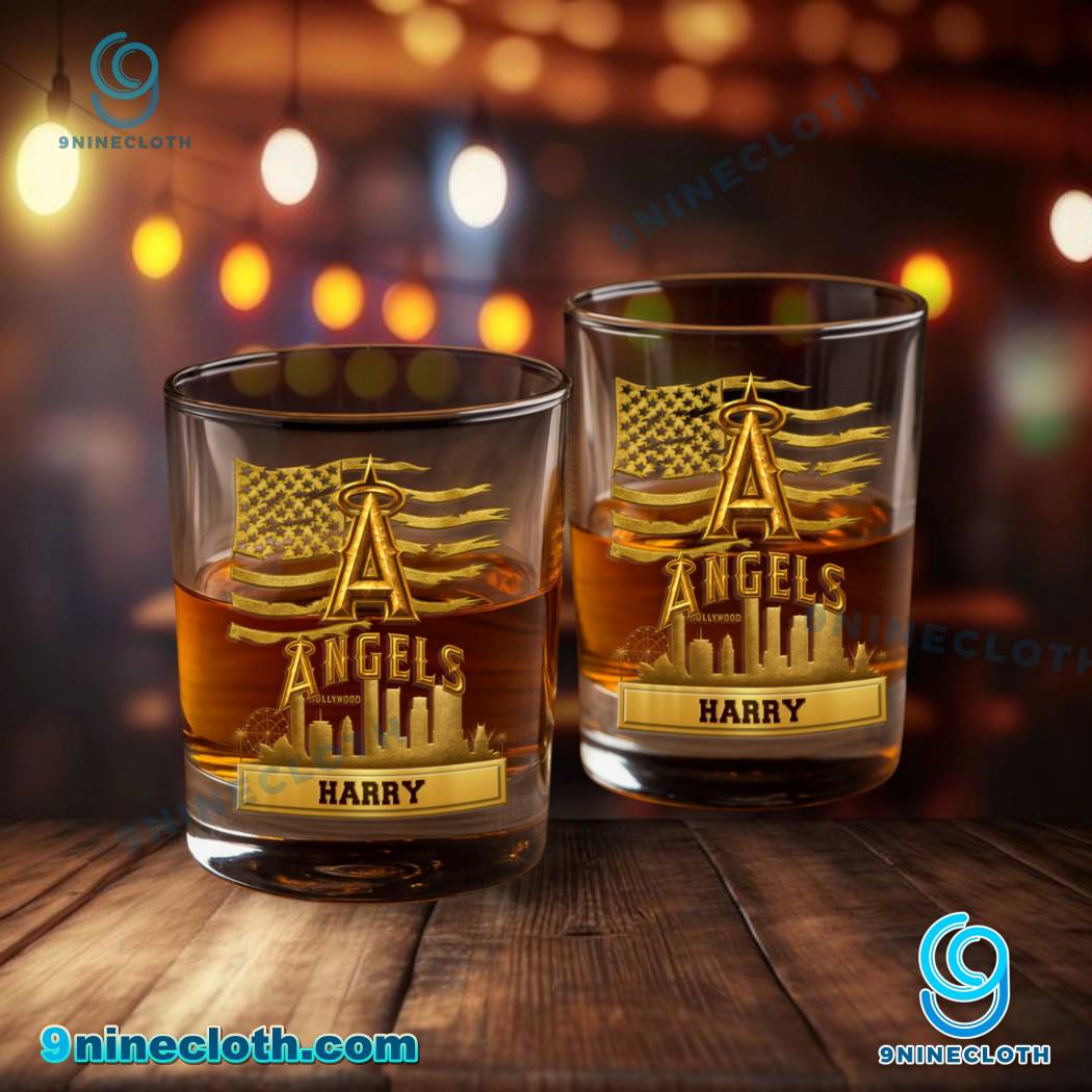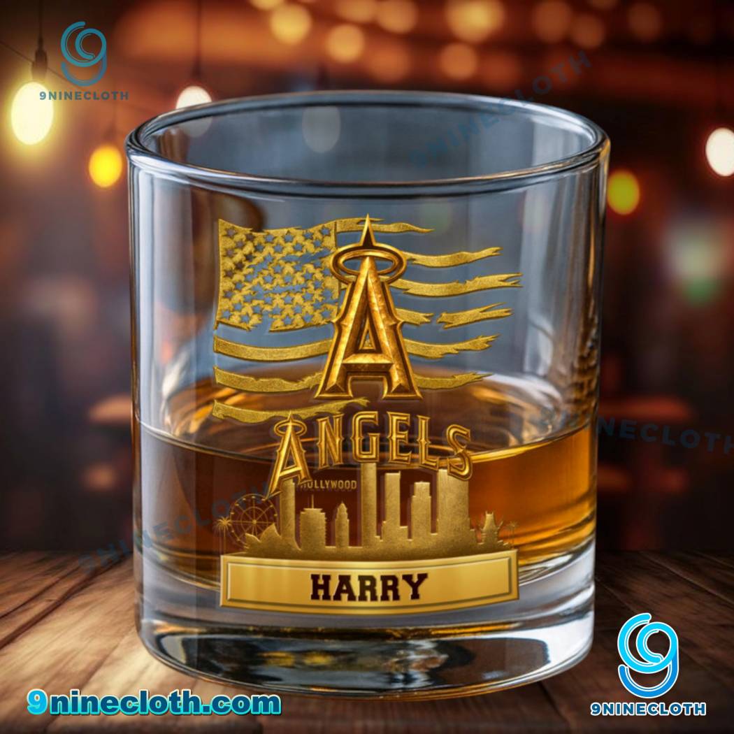 Keywords: Los Angeles Angels, Whiskey Glass, American Flag, City Skyline, Personalized Gift, Baseball, MLB, Fan Gear, Home Bar, Drinkware, Bourbon, Spirits, 9ninecloth, Los Angeles, California.