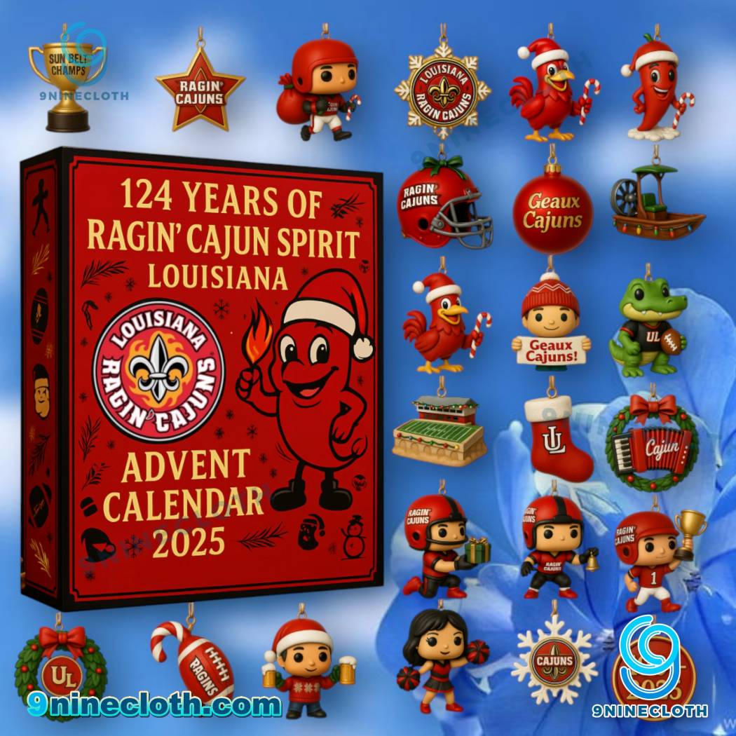 Keywords: Louisiana Ragin’ Cajuns, Advent Calendar, 2025, Christmas, Handmade, Ornaments, Holiday, College Football, Team Spirit, Fan Gear, Unique Gift, Sports, 9ninecloth, Ragin Cajuns