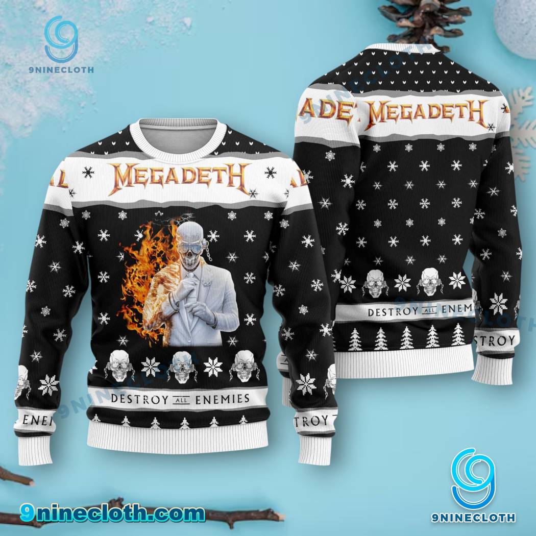 Keywords: Megadeth, ugly Christmas sweater, metal Christmas sweater, band merch, holiday sweater, Destroy All Enemies, Christmas gift, 9ninecloth, rock Christmas, metalhead gift.