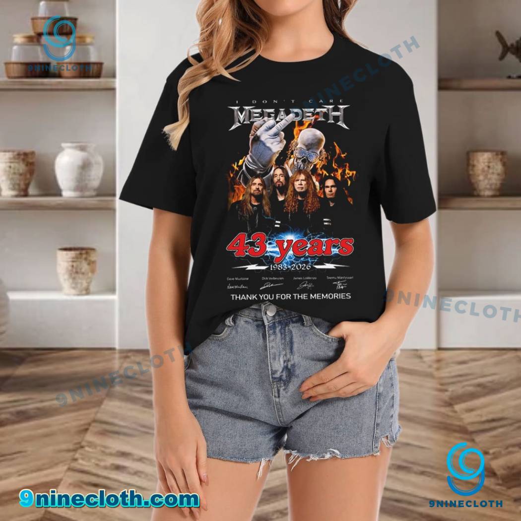 Keywords: Megadeth, Megadeth shirt, metal band merch, thrash metal, concert t-shirt, band apparel, Dave Mustaine, 1983-2026, signature shirt, I Don’t Care, 43 years.