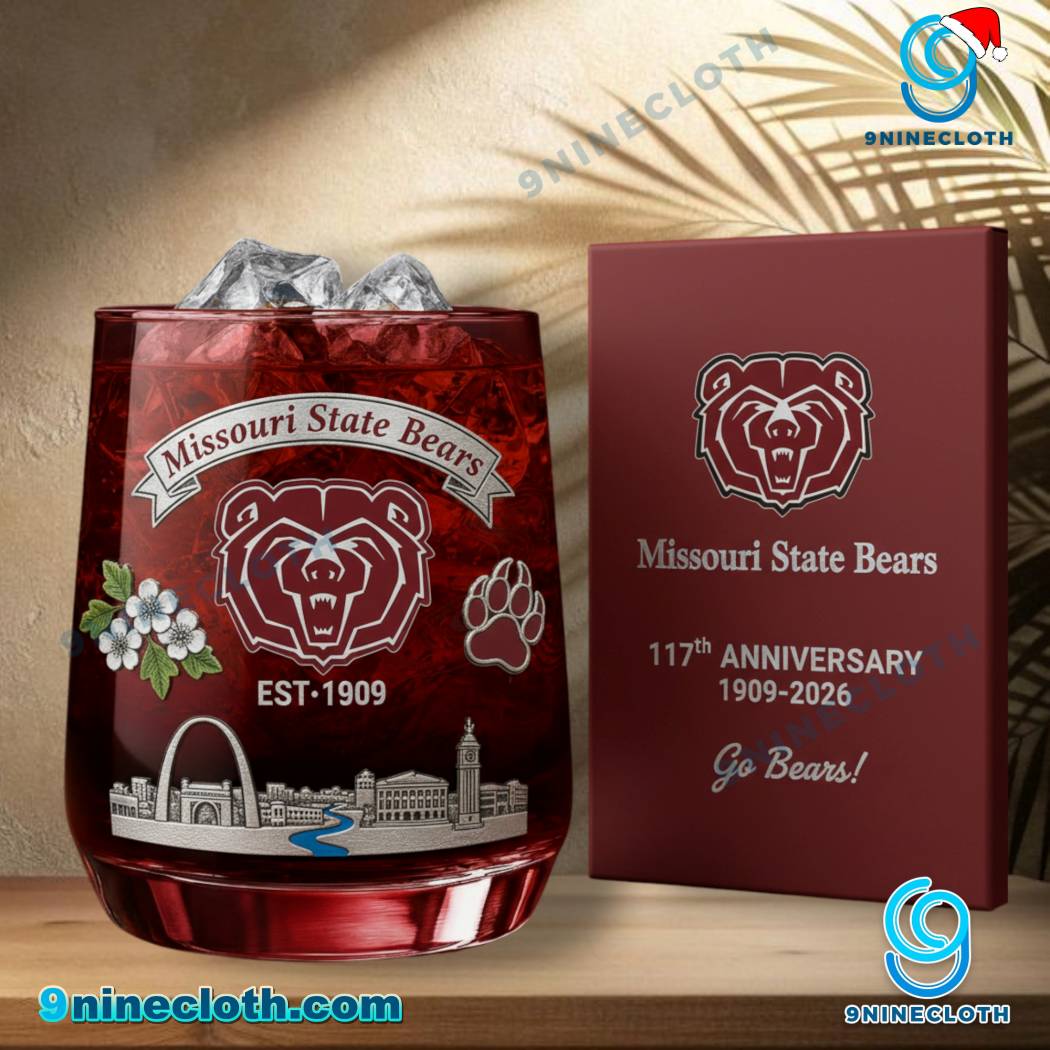 Keywords: Missouri State Bears, Whiskey Glass, 117th Anniversary, 1909-2026, Bears, MSU, College Sports, Fan Gear, Drinkware, Bourbon Glass, 9ninecloth, Gift Ideas, Alumni, University