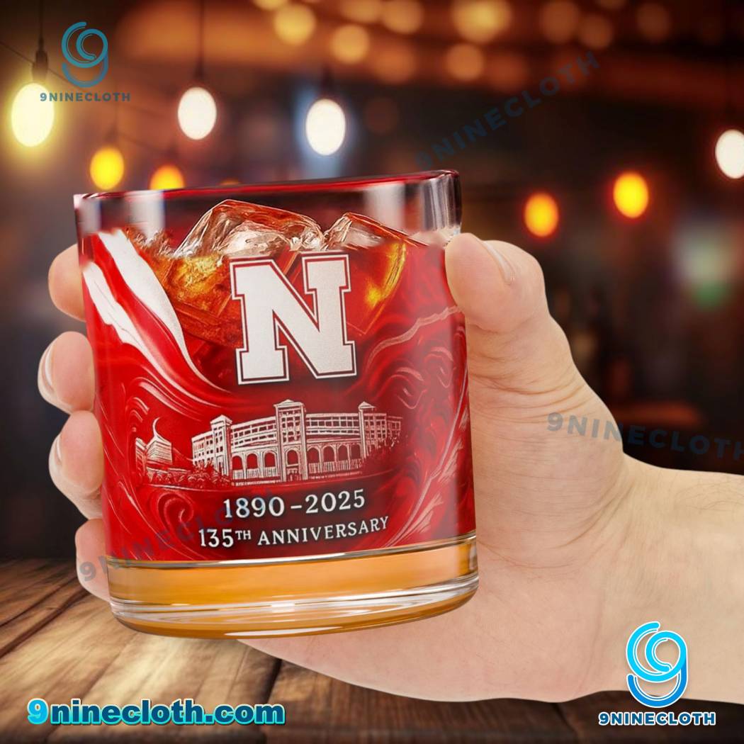 Keywords: Nebraska Cornhuskers, Whiskey Glass, 135th Anniversary, College Football, Huskers, Fan Gear, Drinkware, Collectible, Gift, Big Red, 9ninecloth, Home Bar, Bourbon Glass
