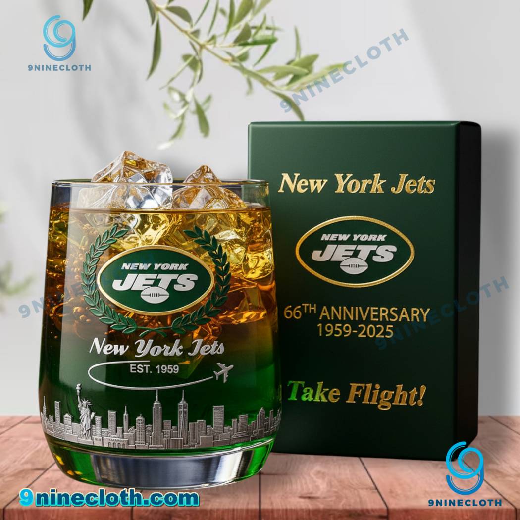 Keywords: New York Jets, Jets, Whiskey Glass, Anniversary, 66th Anniversary, Take Flight, Football, NFL, Gift, Fan, Collectible, Barware, 1959, 2025, 9ninecloth, New York Jets fan gift, Football gift