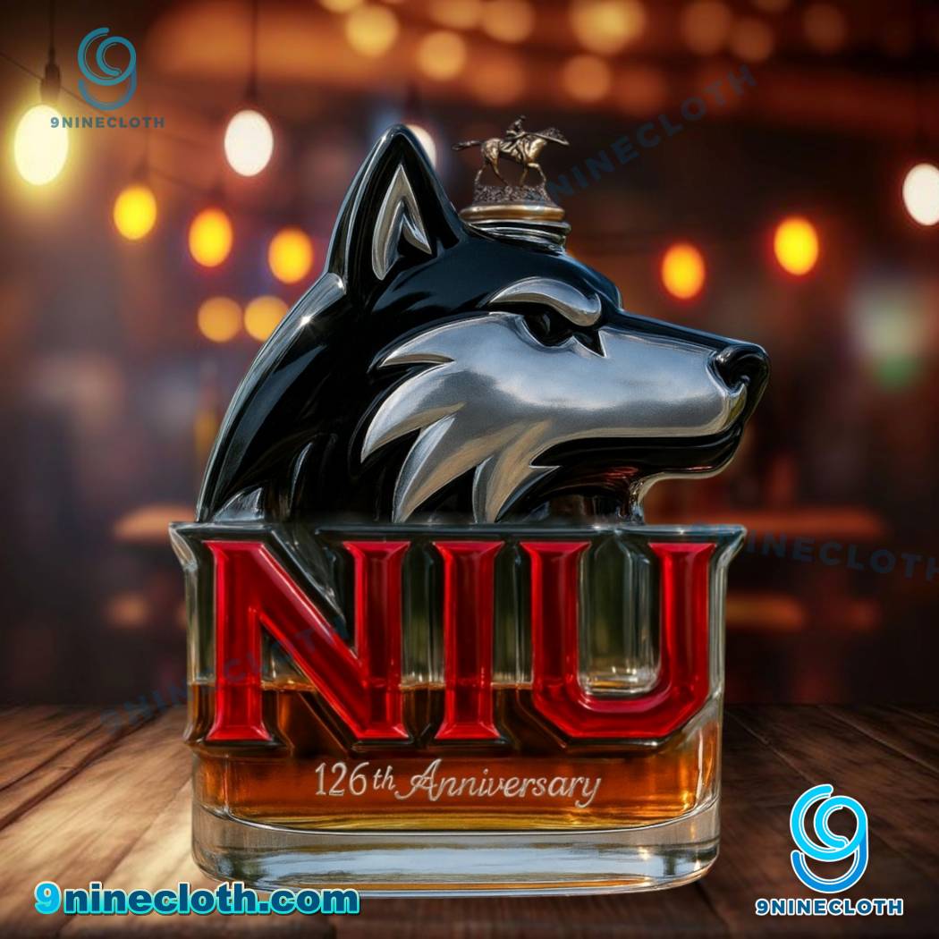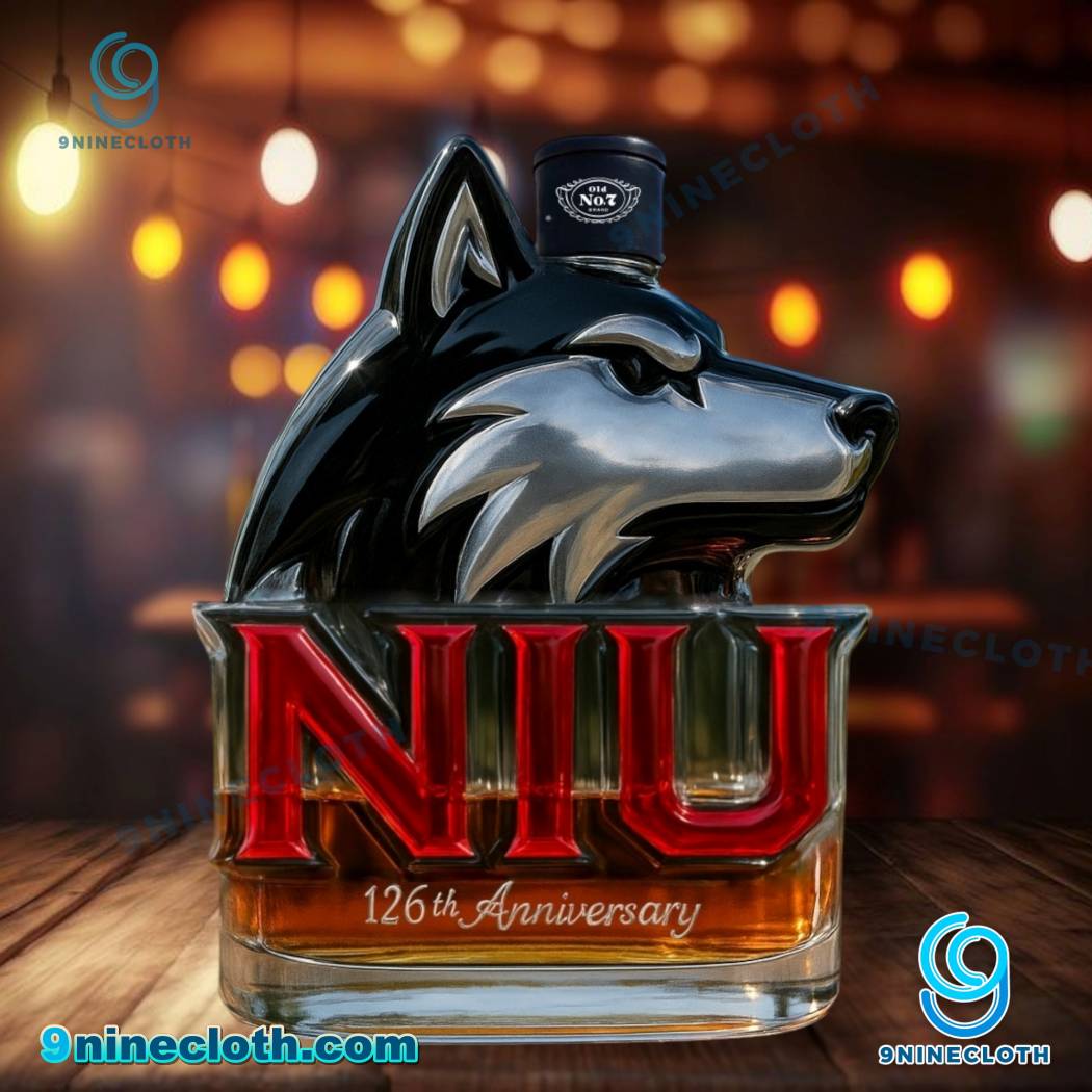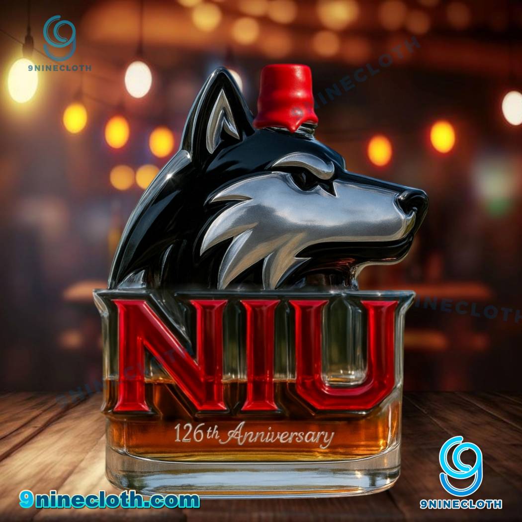 Keywords: Northern Illinois Huskies, NIU, Huskies, Whiskey Bottle, Anniversary, 126th Anniversary, College, Football, Custom Bottle, Glass Bottle, Barware, Collectible, Gift, Alumni, 9ninecloth, Red Wine, Cocktail.