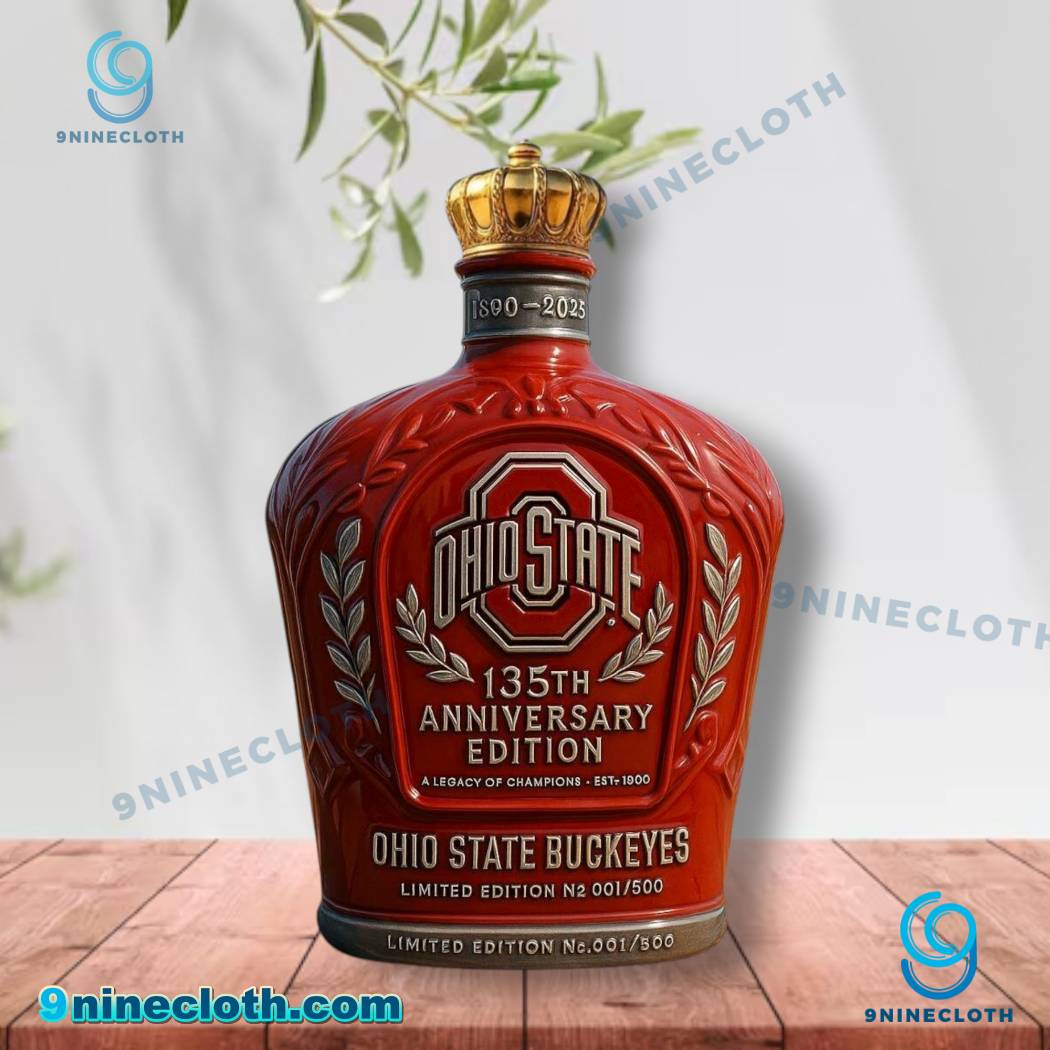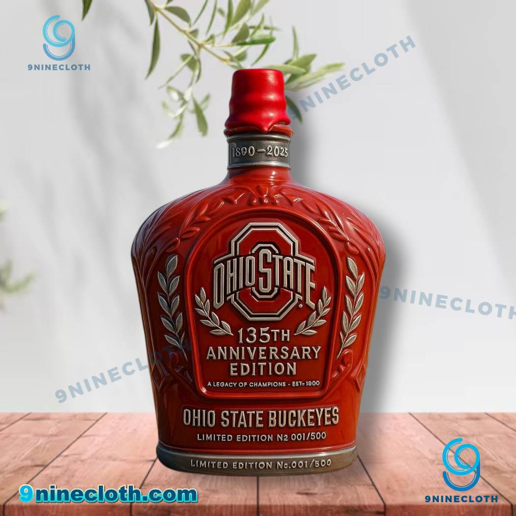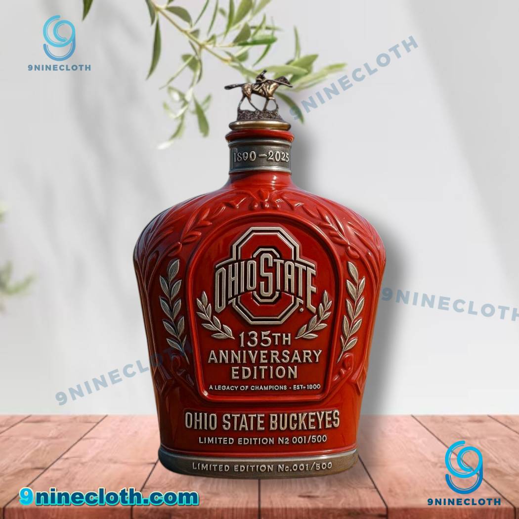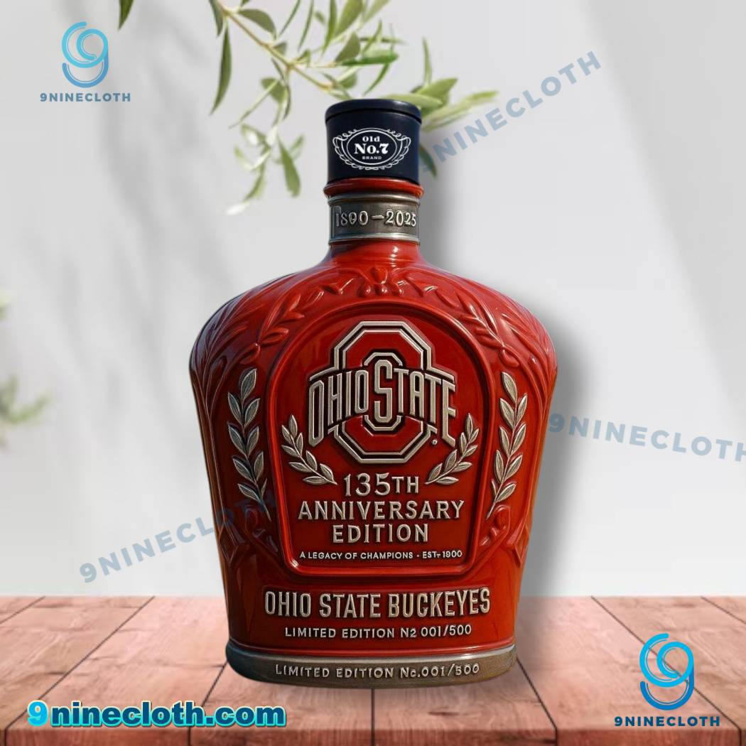 Keywords: Ohio State Buckeyes, Whiskey Bottle, 135th Anniversary, Collectible, Glass Bottle, Ohio State Memorabilia, Buckeye Nation, Sports Fan Gift, Unique Gift, Home Bar, Drinkware, 9ninecloth, Ohio State, Buckeyes, Anniversary, Gift