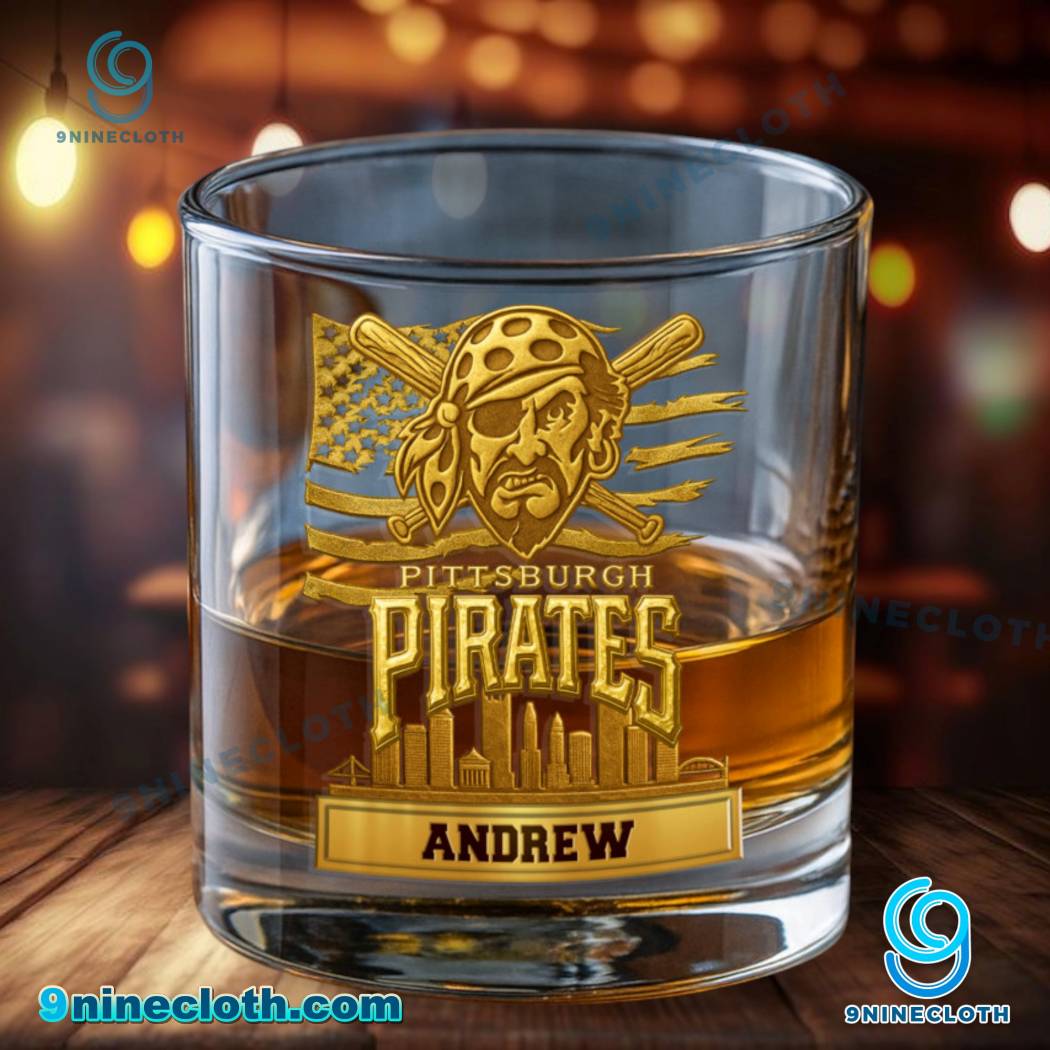 Keywords: Pittsburgh Pirates, whiskey glass, personalized gift, American flag, city skyline, Pittsburgh, baseball fan, home bar, drinkware, 9ninecloth, sports gift, Pirates fan.