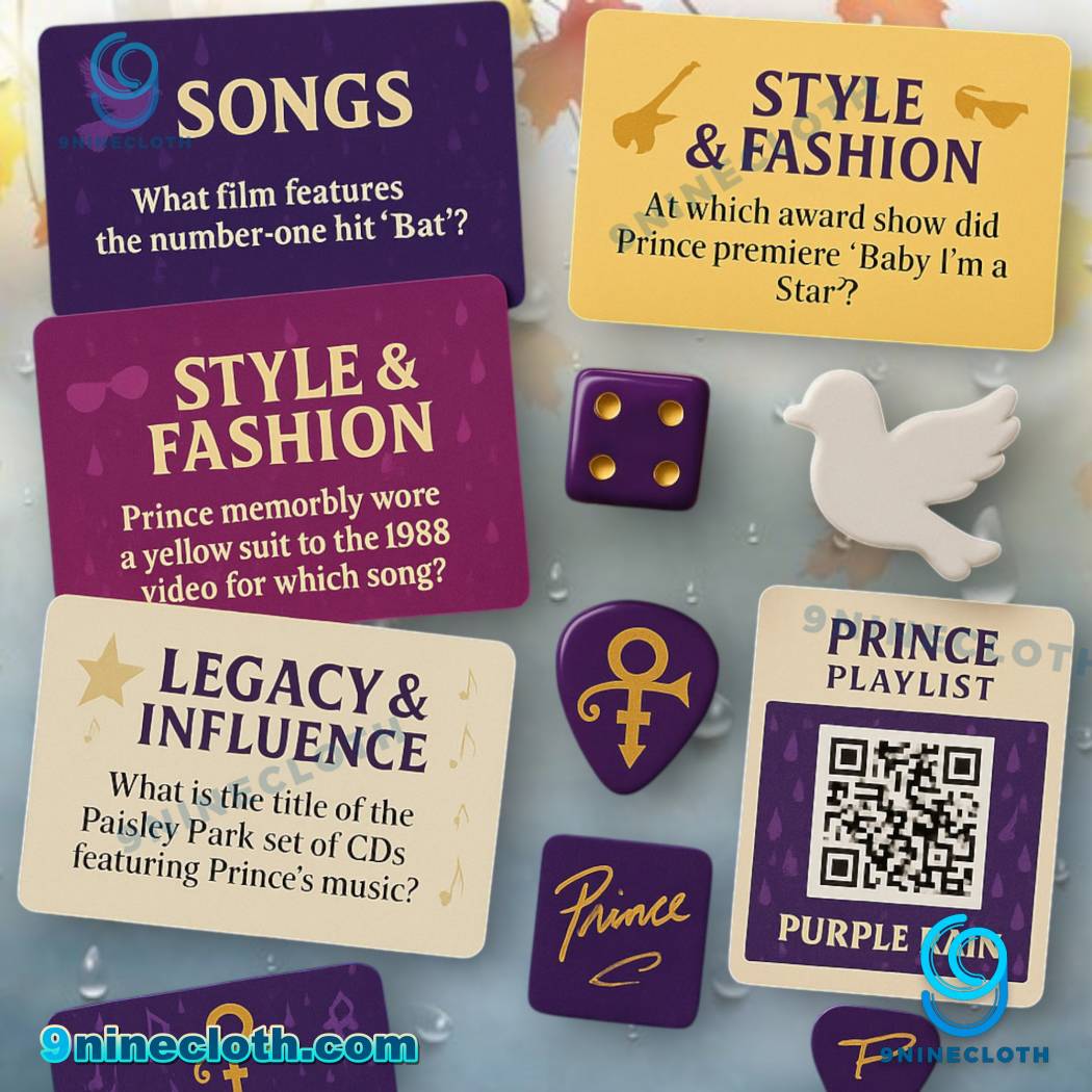 Calling all Prince fans! Dive deep into the iconic world of the “Purple Rain” era and beyond with the Prince From Purple Rain To Pop Icon Trivia Board Game, exclusively from 9ninecloth. This custom-designed board game is the perfect way to celebrate the legacy of the musical genius, testing your knowledge on everything from his groundbreaking albums to his unforgettable performances.