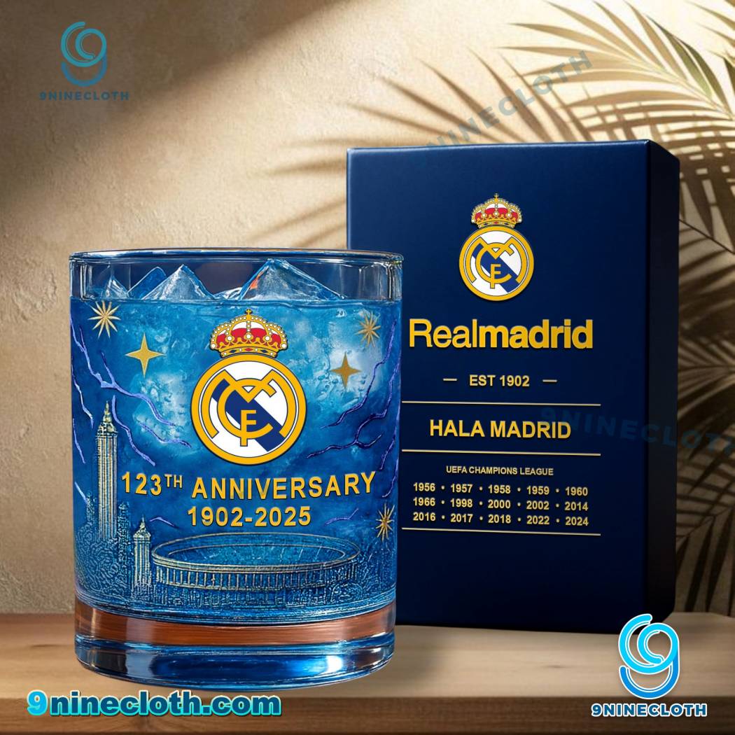 Keywords: Real Madrid, Whiskey Glass, Anniversary, 123th Anniversary, Los Blancos, Football Club, Soccer, Glassware, Drinkware, Bourbon, Home Bar, Fan Gift, Collectible, 1902, 2025, 9ninecloth