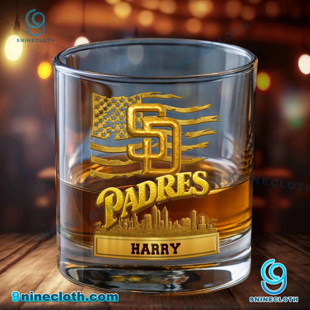 Keywords: San Diego Padres, American Flag, City Skyline, Whiskey Glass, Personalized Gift, Sports Fan, Baseball, Bourbon Glass, 9ninecloth, Drinkware, Home Bar, Padres Gift, San Diego, Souvenir
