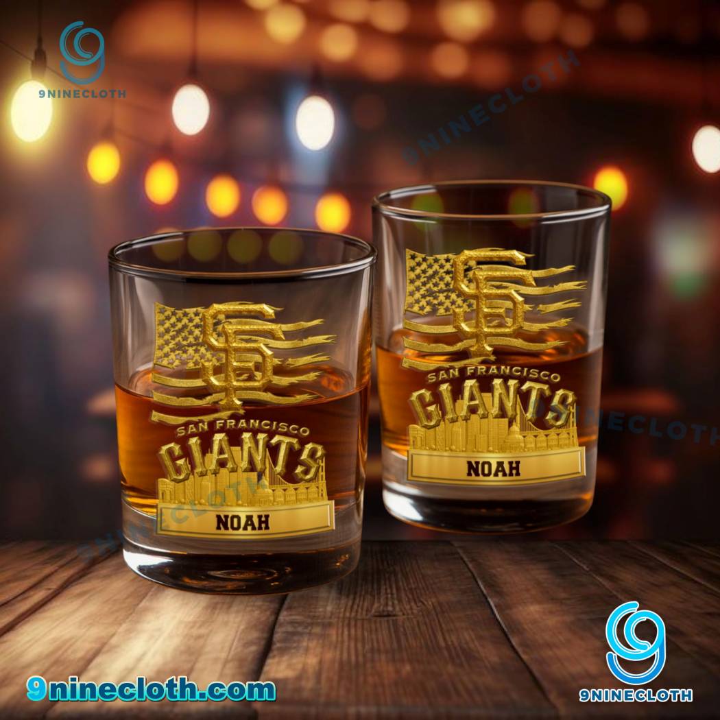 Keywords: San Francisco Giants, Giants, American Flag, City Skyline, Whiskey Glass, Personalized Gift, Baseball, MLB, San Francisco, Bourbon Glass, Fan Gift, 9ninecloth.