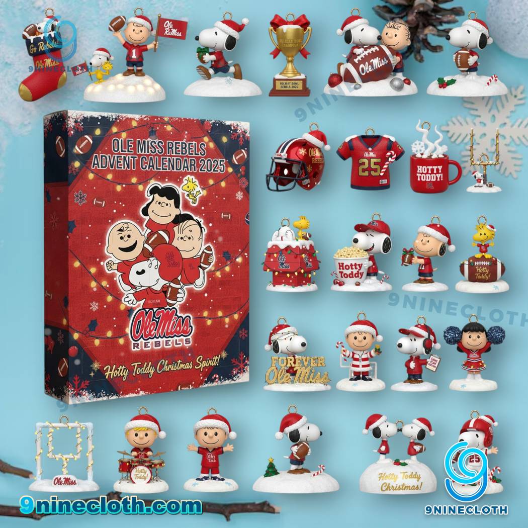 Keywords: Snoopy, Ole Miss Rebels, Advent Calendar, Christmas, Holidays, Ornaments, Handmade, Acrylic, Peanuts, College Football, Rebels, Collectible, 2025, 9ninecloth, Unique Gift, Christmas Decor