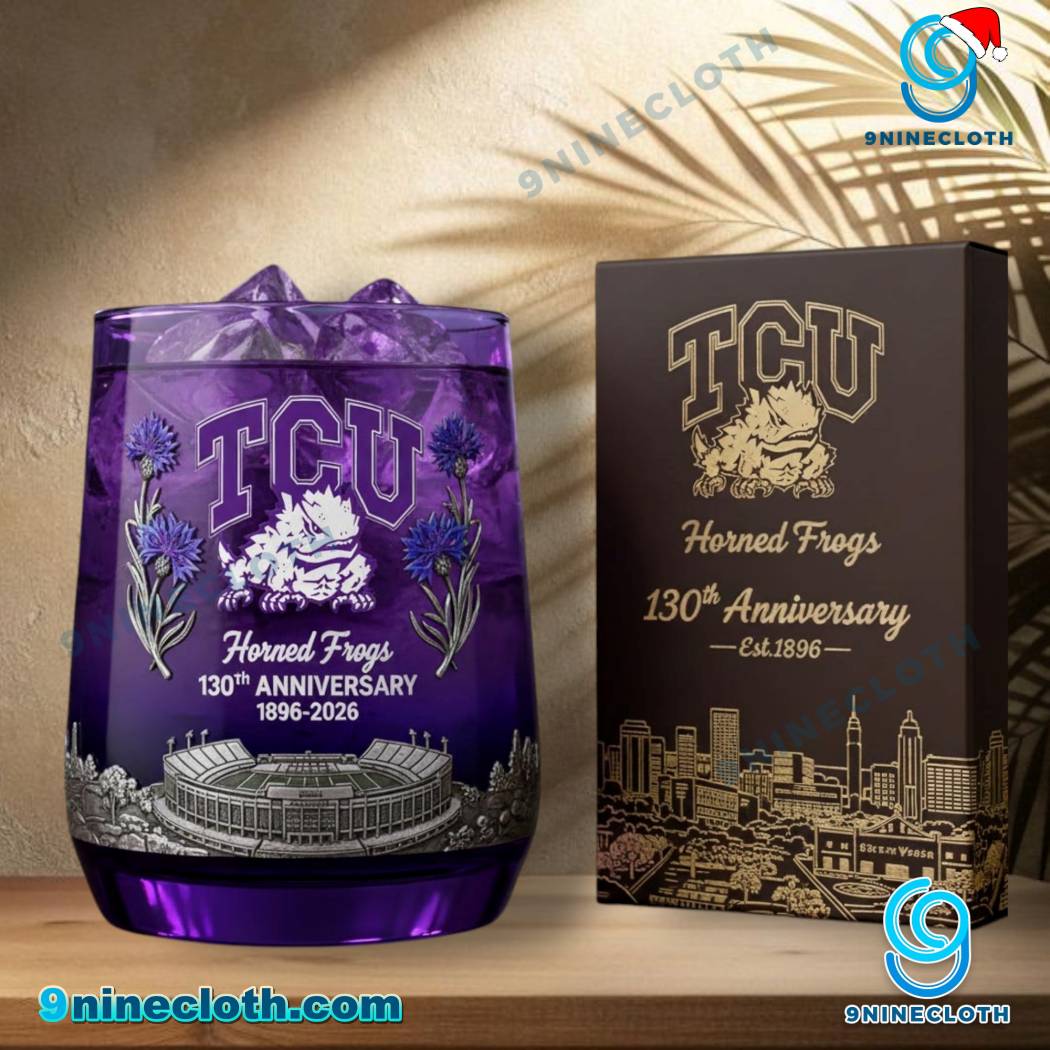 Keywords: TCU Horned Frogs, TCU, whiskey glass, anniversary gift, college sports, NCAA, Horned Frogs merchandise, 130th anniversary, 1896-2026, TCU memorabilia, sports fan gift, college fan gear, 9ninecloth.