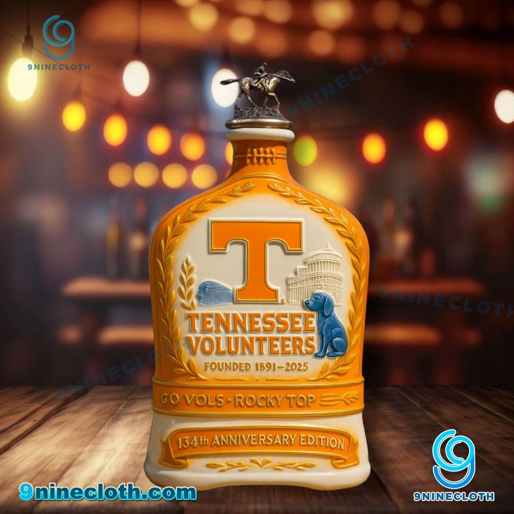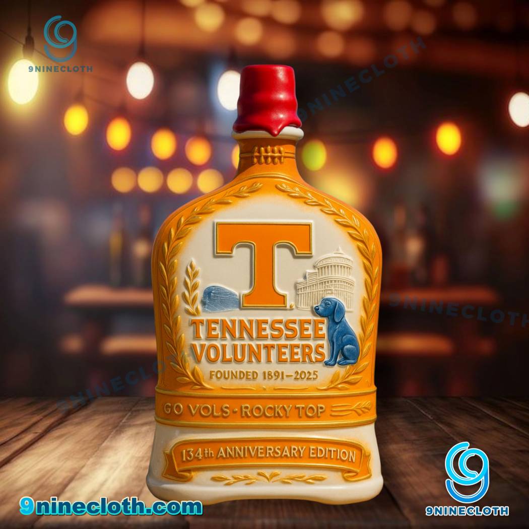 Keywords: Tennessee Volunteers, 134th Anniversary, 1891-2025, Whiskey Bottle, Glass Bottle, Custom Shape, University of Tennessee, Football, Sports, Collegiate, Fan Gear, Collectible, Gift, 9ninecloth