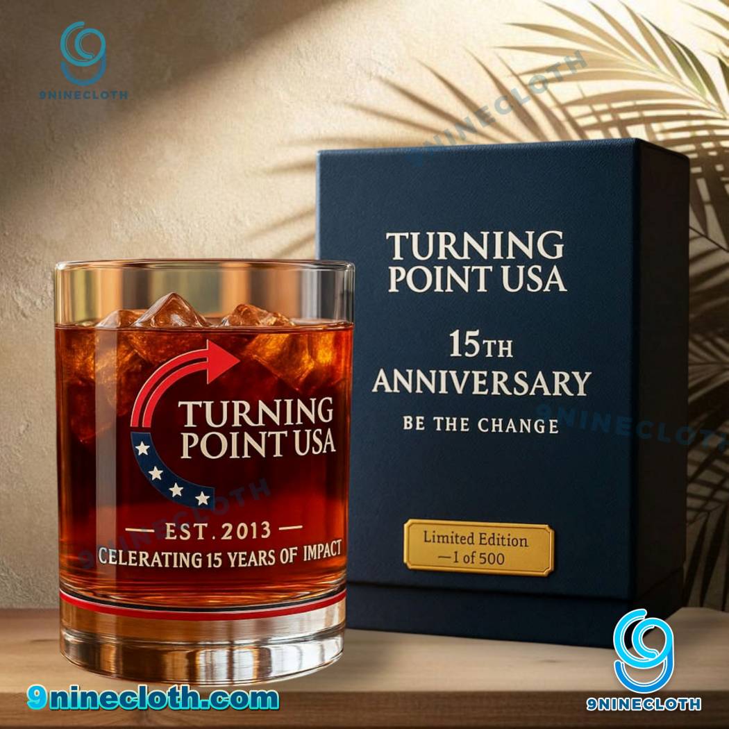 Keywords: Turning Point USA, TPUSA, Whiskey Glass, 15 Years, Anniversary, Conservative, Politics, Drinkware, Bourbon, Gift, 9ninecloth, High-Quality Glass